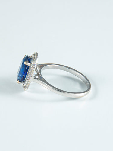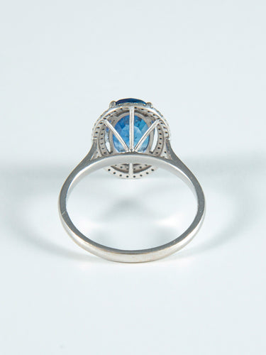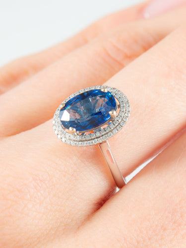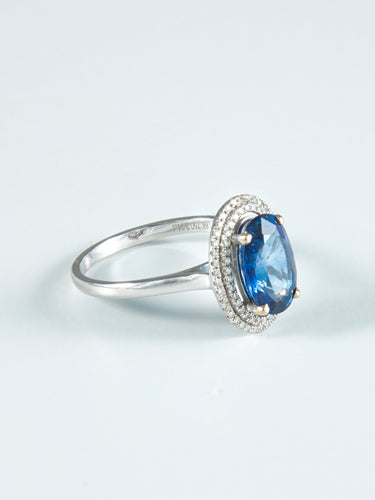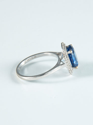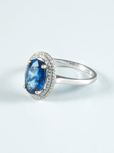 750/1000th white gold ring adorned with an oval sapphire surrounded by diamonds.