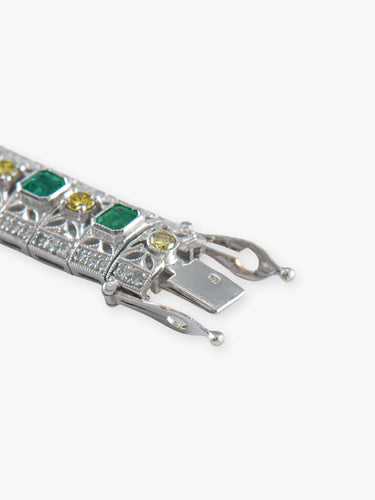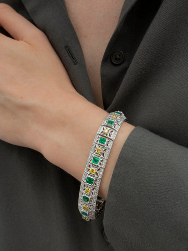 Bracelet in 18-carat 750‰ white gold, composed of emeralds, yellow diamonds and white diamonds.