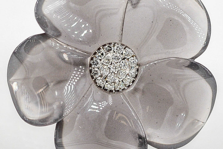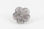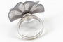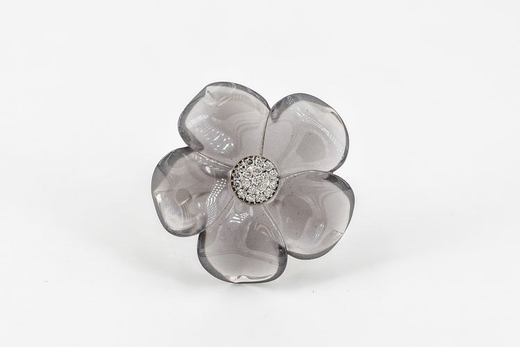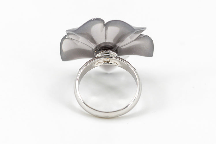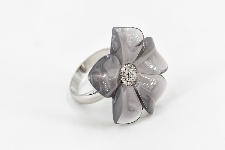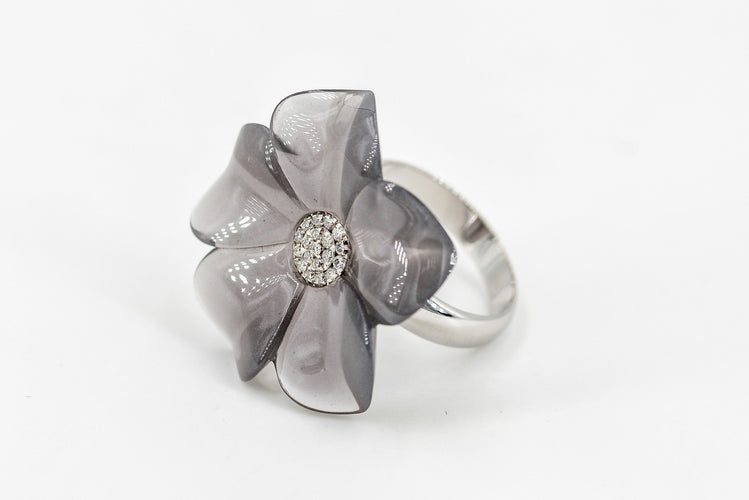 Ring from Maison André Bénitah, "Printania" model, in the shape of a flower, in 18-carat white gold, set with diamonds for a total of 0.09 carats, size 8/8, color GH, purity VS-SI, flower in gray resin.