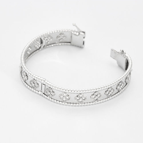 Magnificent rigid opening bracelet in 18K (750 thousandths) white gold with hinges branded from the Maison Van Cleef & Arpels. It is composed of a bangle highlighted with a pearl border and centered with quadrilobed motifs adorned with eighty small brilliant-cut diamonds.
