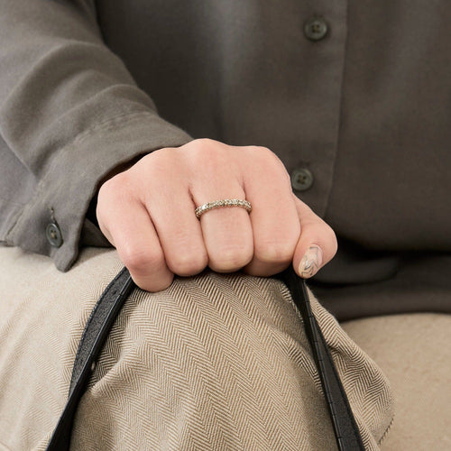 Wedding band in 18K (750 thousandths) white gold set with diamonds each weighing 0.02 carats, set with four claws.