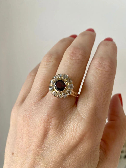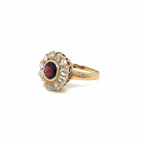 Antique ring in 18 carat yellow gold with garnet and diamond.