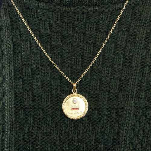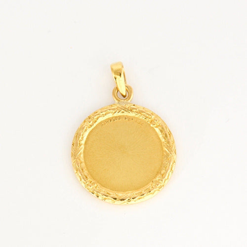 AUGIS - Important Love Medal pendant in 18K (750 thousandths) yellow gold, round, decorated with the inscription "+ qu'hier - que demain" and set with five small round diamonds and three rectangular synthetic rubies, the border decorated with plants.