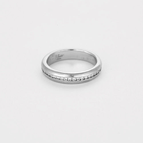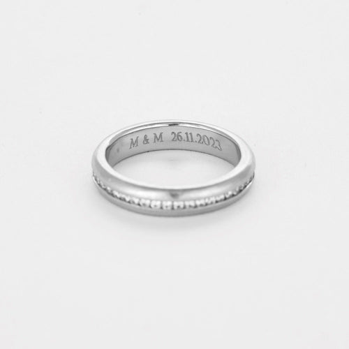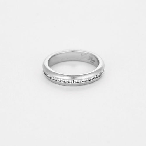 - Wedding band in platinum (950 thousandths) adorned with a line of small brilliant-cut diamonds weighing approximately 0.01 carat each, channel-set.