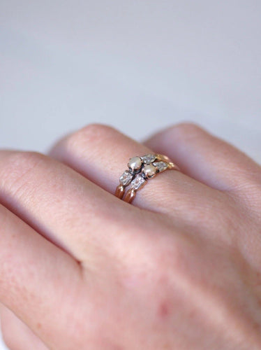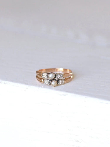 Belle Epoque double band ring in pink gold and platinum (hallmarks: owl and mascaron) decorated with fine pearls and rose-cut diamonds.