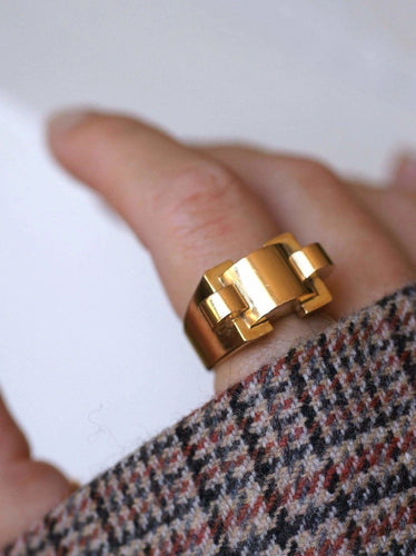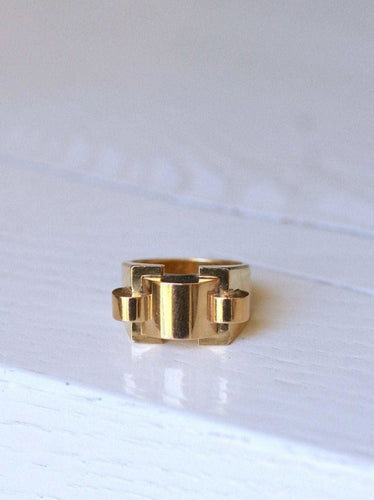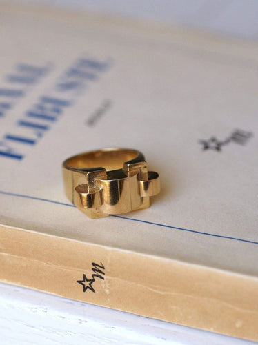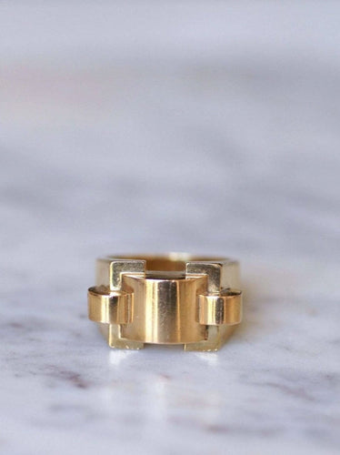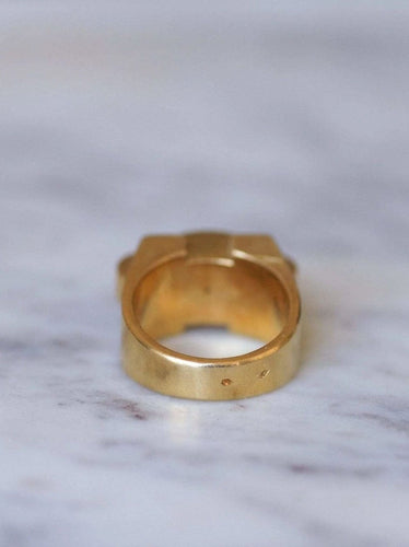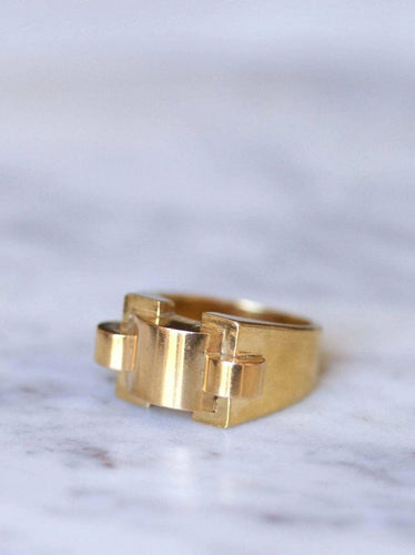 Signet ring tank composed of an 18Kt yellow gold setting (hallmark: eagle's head) with geometric decorations in a so-called mechanical style.