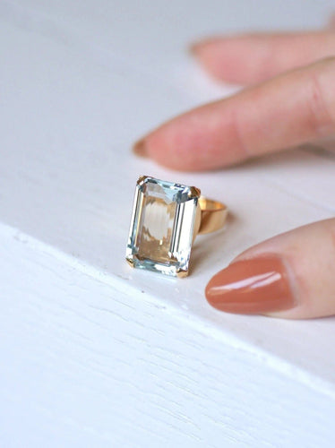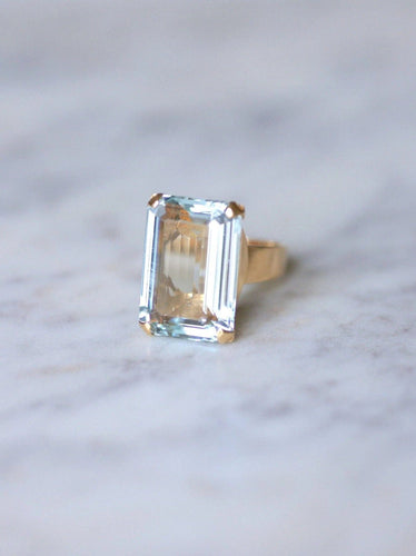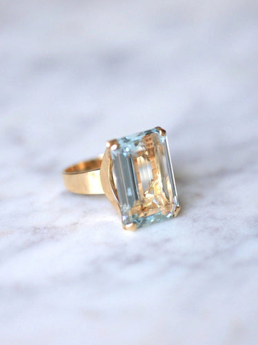 Vintage cocktail ring in 18Kt rose gold (eagle's head hallmark), the center of which is decorated with a beautiful aquamarine, rectangular with cut sides, weighing approximately 15.00 Cts.