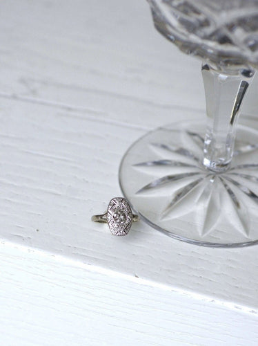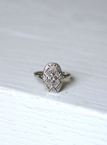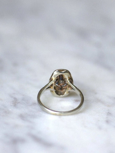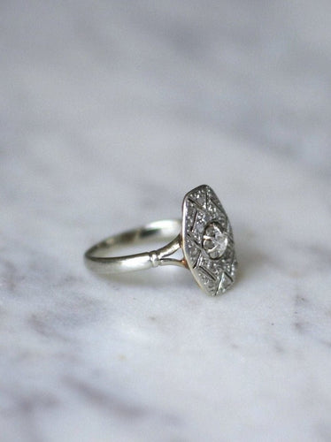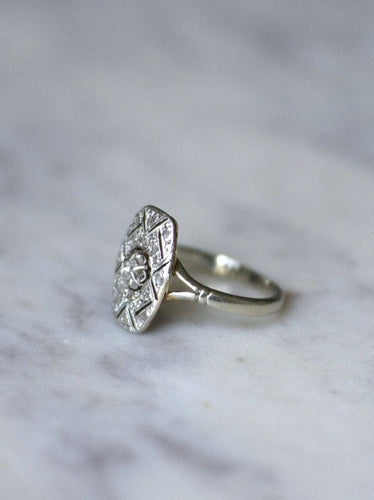 Rectangular engagement ring Art Deco in 18kt white gold and platinum, set with rose-cut diamonds.