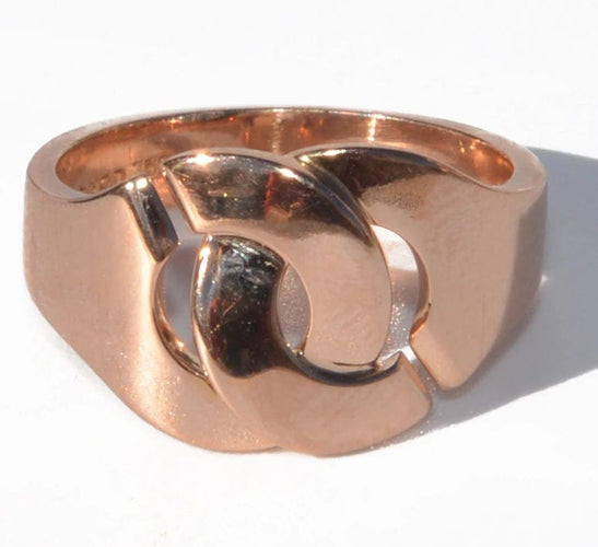 Ring Dinh Van Menottes R12 in pink gold, composed in its center of a pair of openwork handcuffs.