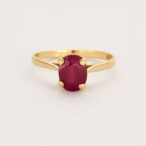 18K (750 thousandths) yellow gold bangle ring, adorned with a faceted oval ruby weighing 1.60 carats, set with four claws.