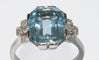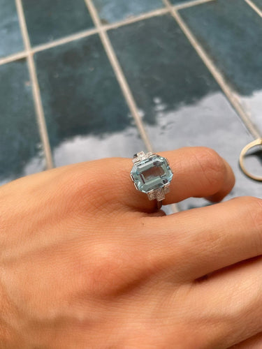 Ring in platinum centered with a rectangular aquamarine with cut sides, supported by four 8/8 diamonds on each side.