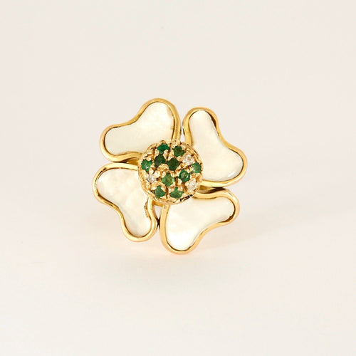 Yellow gold clover ring with mother-of-pearl, diamonds and emeralds