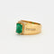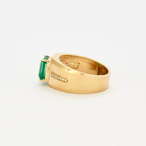Large bangle ring in 18K (750 thousandths) yellow gold adorned with a rectangular step-cut emerald weighing approximately 2 carats surrounded and supported by small brilliant-cut diamonds measuring 0.01 carat each.