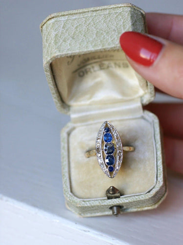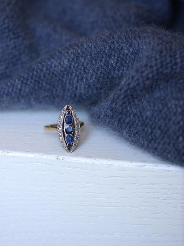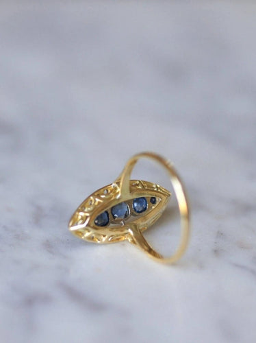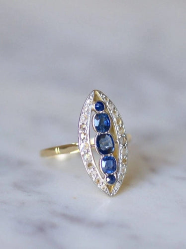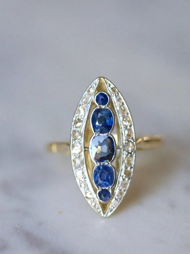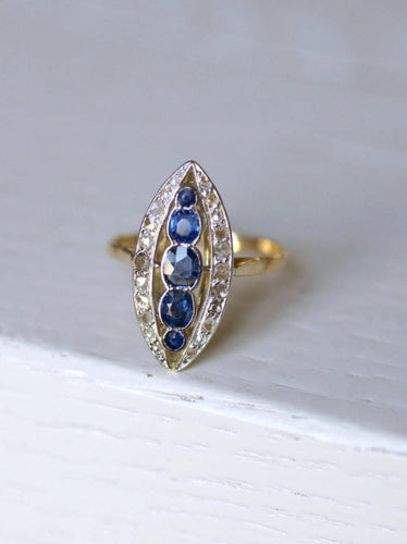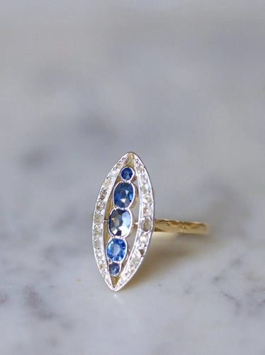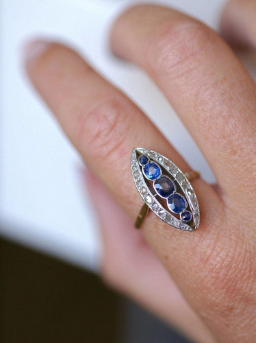 Marquise ring in 18Kt yellow gold and platinum (mark: owl), adorned in its center with five sapphires weighing a total of approximately 1.00 Ct, in an entourage of rose-cut diamonds whose total weight is estimated at approximately 0.40 Ct.