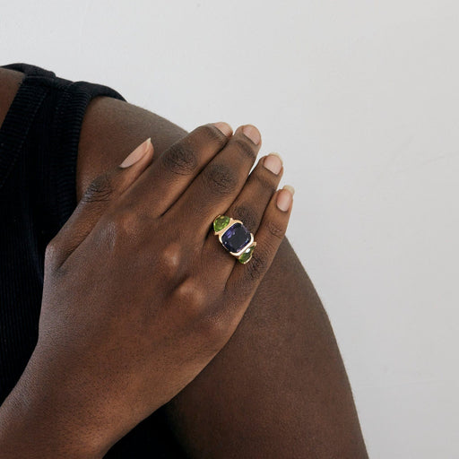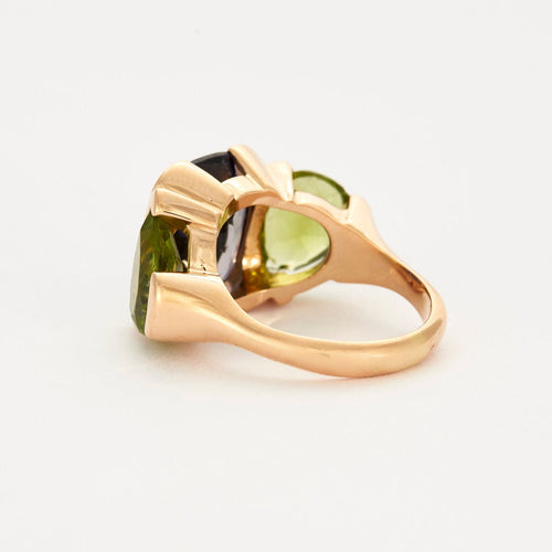 Yellow gold ring adorned with a blue tourmaline and peridots