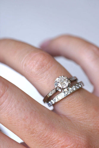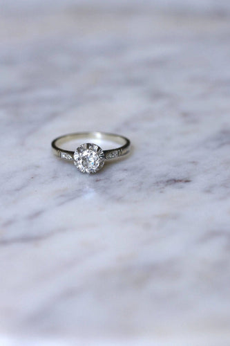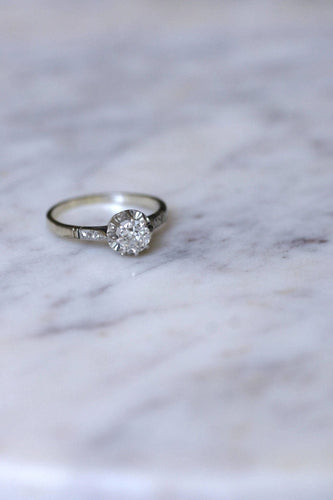 Solitaire ring in 18kt white gold and platinum (hallmarks: owl and Mascaron) set in its center with an old-style cut diamond, weighing approximately 0.50 Ct (estimated color H, estimated purity SI) and a shoulder of rose-cut diamonds.