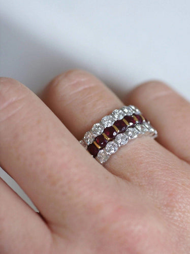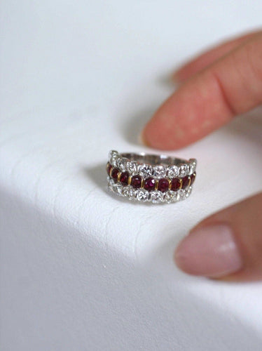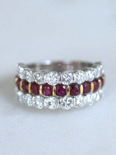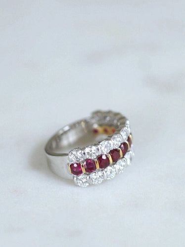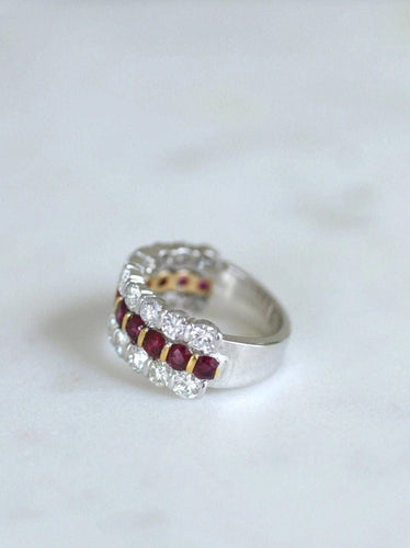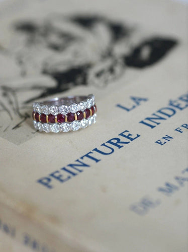 Vintage triple ring in 18kt yellow gold and platinum (eagle's head and dog hallmarks), decorated in its center with a line of rubies (whose total weight is estimated at approximately 1.30 Cts) surrounded by two lines of brilliant-cut diamonds (whose total weight is estimated for approximately 3.20 Cts) whose color is estimated H, and purity VS.