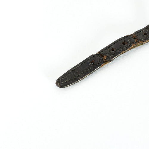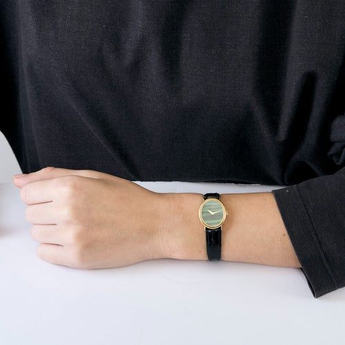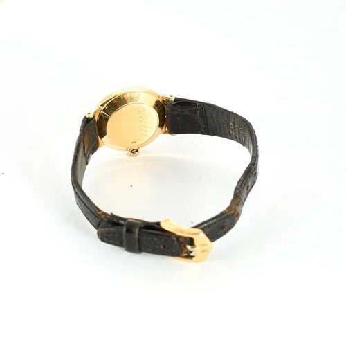Ladies' wristwatch in 18K (750 thousandths) yellow gold. Oval case, Dial with malachite background and branded. Hand-wound mechanical movement. Black crocodile strap with pin buckle no. 38232 2.