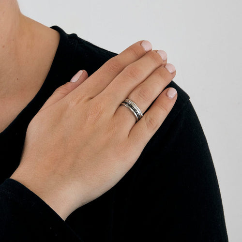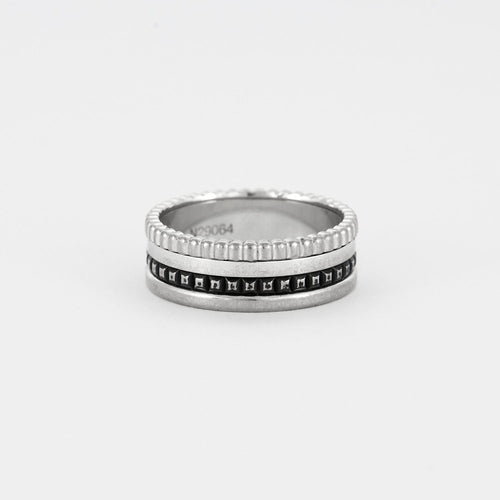 BOUCHERON - Quatre Black Edition- Small - Ring in 18K (750 thousandths) white gold composed of quatre chiseled gadroons with grosgrain, clou de Paris and smooth pattern alternating with a black PVD line. Sign Boucheron, numbered, maker's mark, Swiss titling mark.