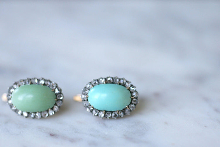 Leverback earrings in 18kt rose gold and silver decorated with two turquoise cabochons (untreated) in a surround of rose-cut diamonds.