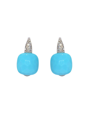 Rare pair of earrings from the house Pomellato model Capri in white gold and diamonds, adorned with a faceted turquoise, on top of a ring paved with brilliant-cut diamonds.