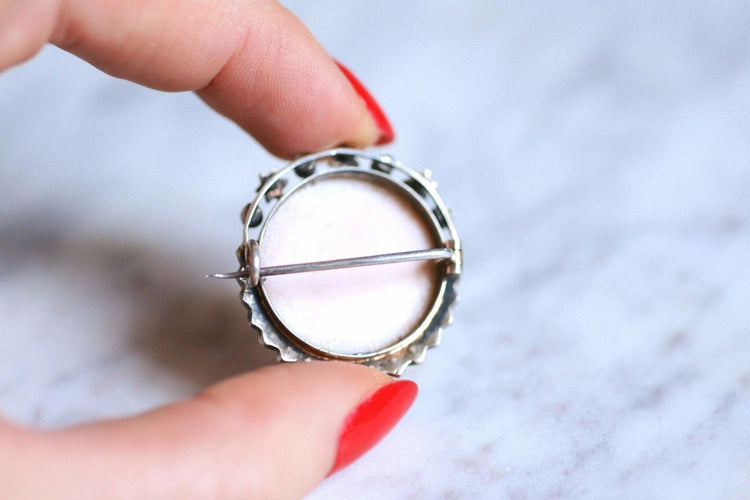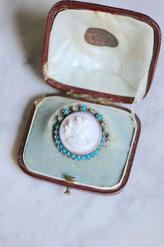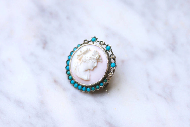 Old Austrian brooch cameo pink shell, turquoise, and pearls on silver