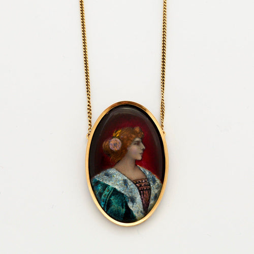 - Chain and pendant in 18k (750 thousandths) yellow gold in an oval shape decorated with a polychrome enameled miniature depicting an elegant woman.
