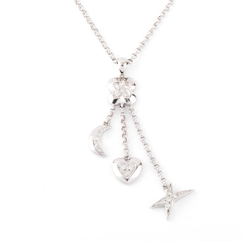 White gold and diamond necklace from the house Mauboussin decorated with 4 diamond-paved clover, crescent Moon, heart and star motifs.