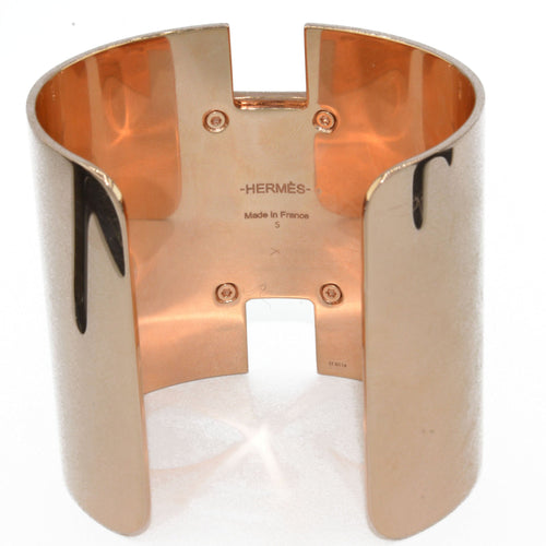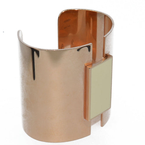 Large cuff bracelet in gold metal, centered by a beige lacquer. 6 cm.