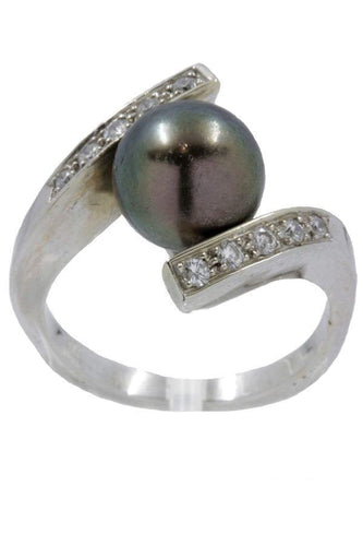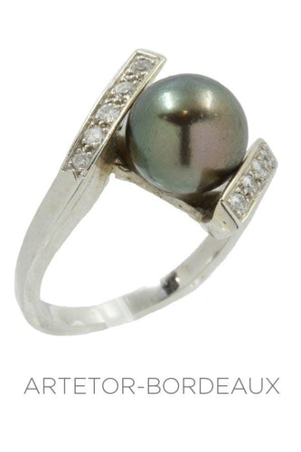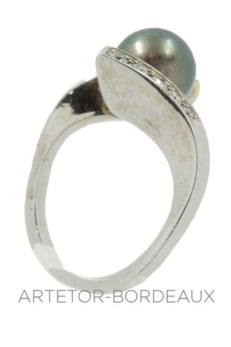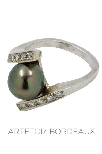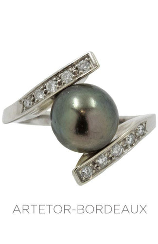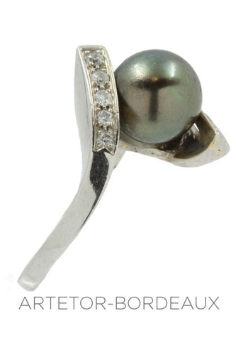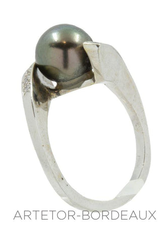 This modern ring is inspired by jewelry, it is set with a black Tahitian pearl and diamonds.