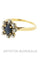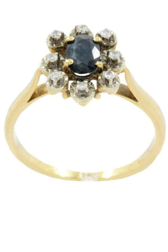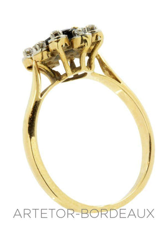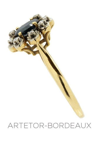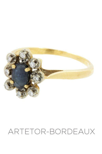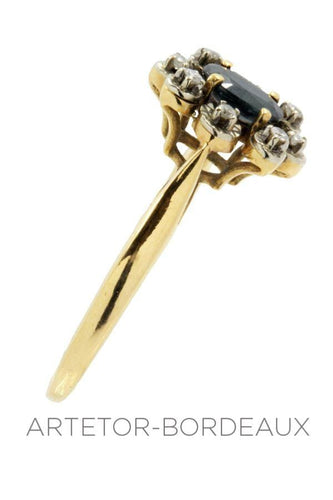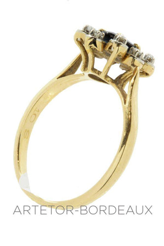 This modern ring is set with a central sapphire of 0.20 carat and a surround of diamonds for a total of 0.16 carat.