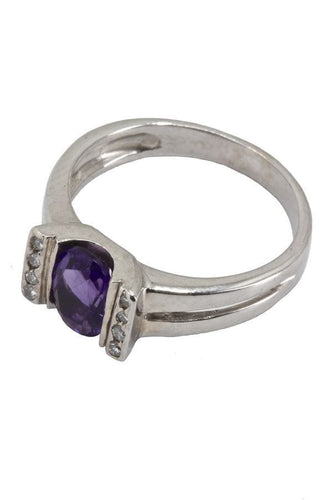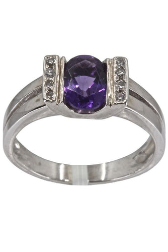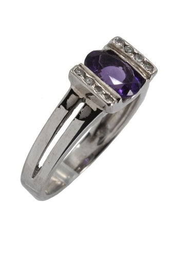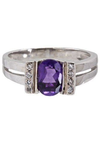 This modern ring is set with an amethyst of approximately 1 carat. Amethyst is a purple-hued quartz crystal that gets its color from manganese, iron and titanium.