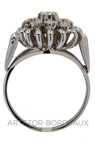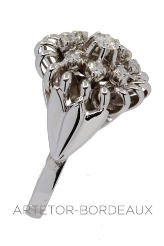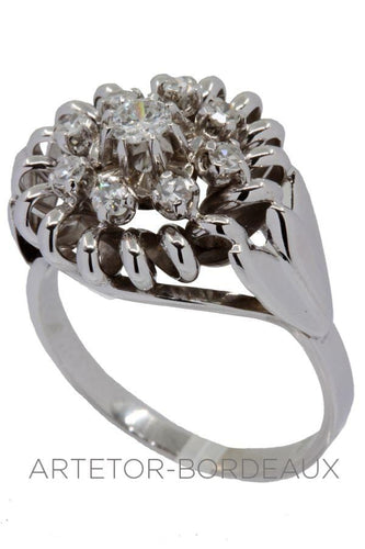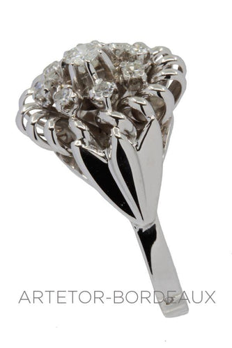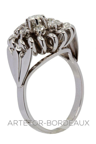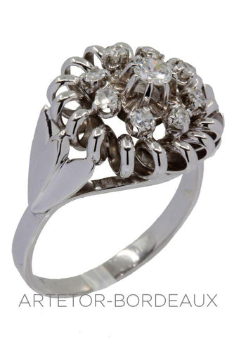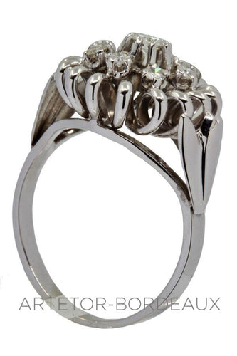 This ring dates from the 1950s, it is set with modern cut diamonds.