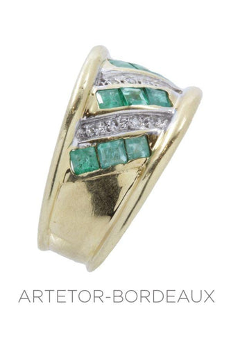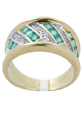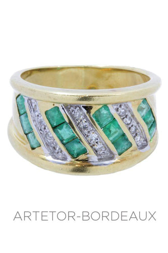 This modern ring is set with calibrated emeralds and modern cut diamonds.