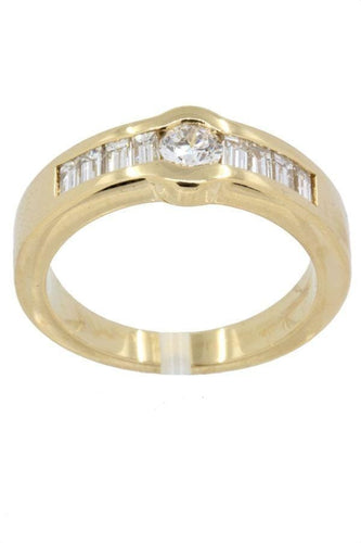 This modern ring is set with a diamond in its center and a baguette surround.