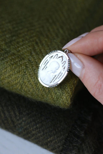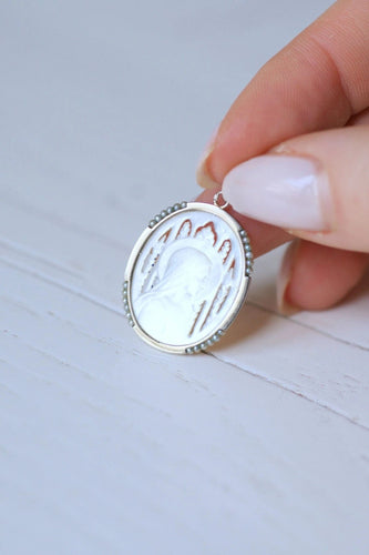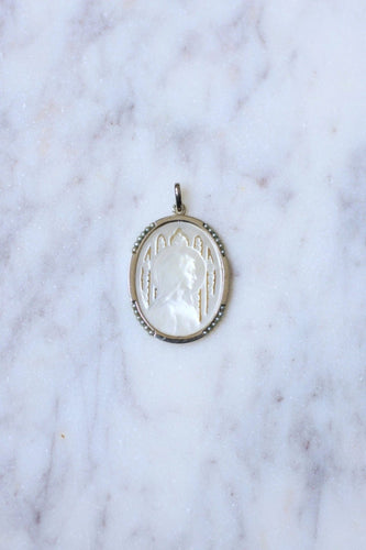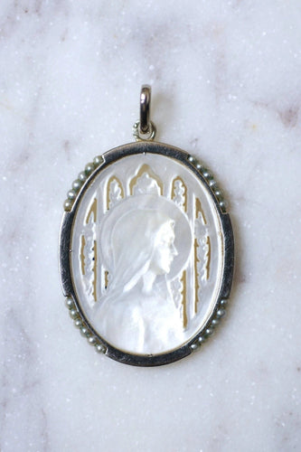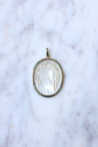 Old medal Art Deco Virgin on mother-of-pearl, white gold, and pearls