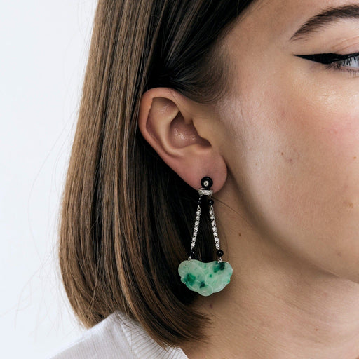 Earrings in platinum '900 MM), each adorned with an onyx disc centered with a diamond above a bar adorned with diamonds bearing two diamond drops in setting and punctuated by two onyx pearls linked by an engraved jade motif.