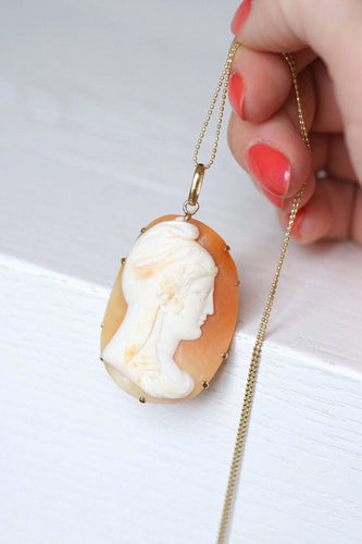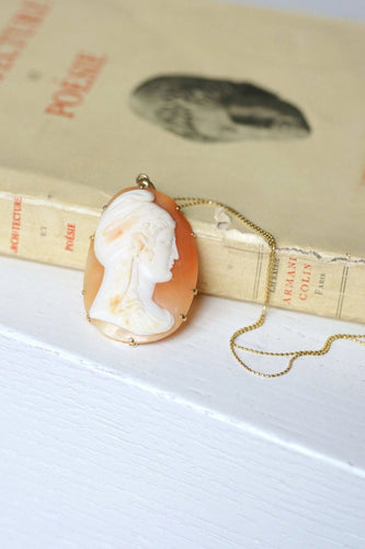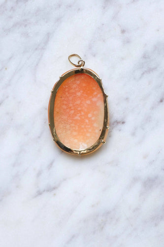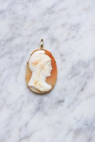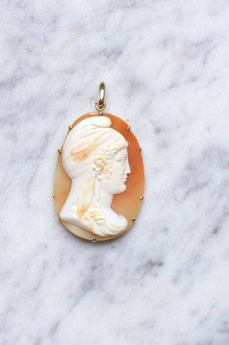 Oval pendant in 18 Kt yellow gold(hallmark: owl), set with a cameo shell representing a Marianne or woman with a Phrygian cap in bust in profile on the right in an antique style.
