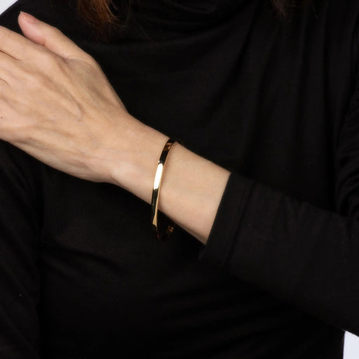 The high polish bangle bracelet measures 4mm wide and is great worn alone or layered. The bangle is designed to fit a small wrist (please check your size prior to purchase). Weighing 7.8 grams the bangle has a light feel to the touch.
